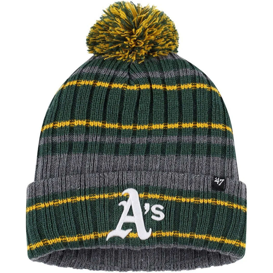 - Keep your noggin’ warm and enjoy a boost of Oakland Athletics spirit each time you reach for this bold Rexford cuffed knit hat with pom from ’47. It features an embroidered Oakland Athletics graphic on the cuff and a striped design that offers an understated look fit for game day. Plus, the fun pom on top provides a jovial spin on your showing of team pride.