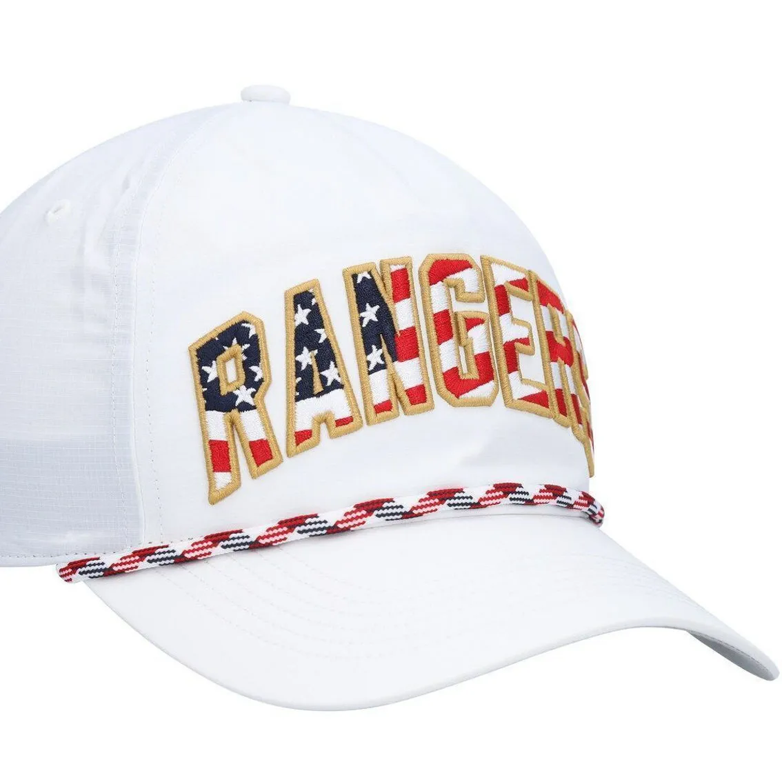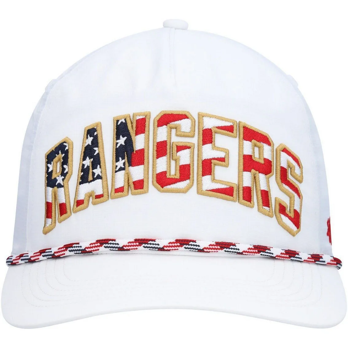 - Express your patriotism and Texas Rangers fandom with this Flag Flutter Hitch snapback hat from ’47. Its contrast-color undervisor and braided rope add a unique flair. A woven Texas Rangers clip tag on the back completes the look.