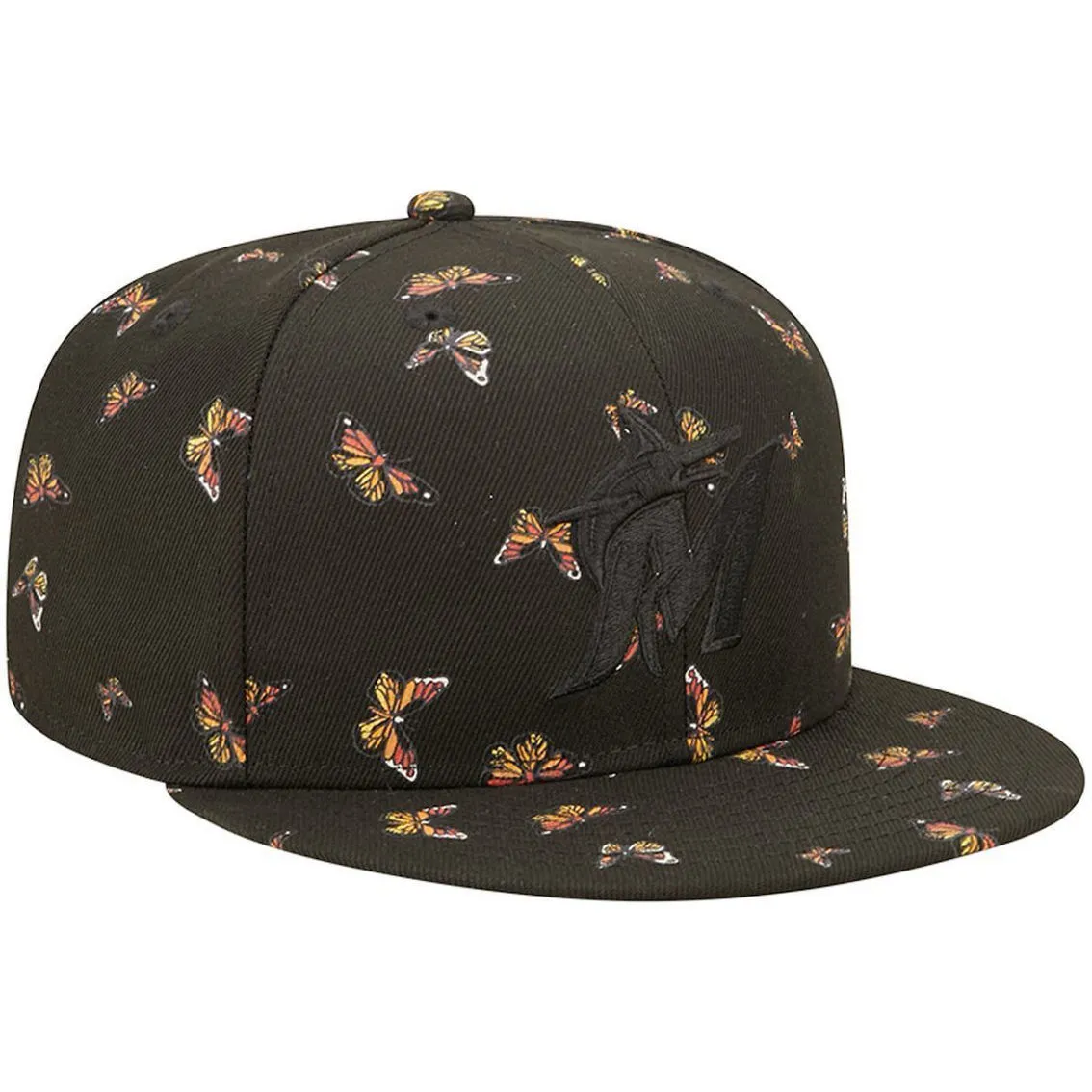 - This New Era Flutter 59FIFTY fitted hat displays your Miami Marlins spirit in a charming fashion. It features a trendy high crown and structured fit for a classic look. Best of all, the colorful butterflies add a cute touch to your Miami Marlins getup.