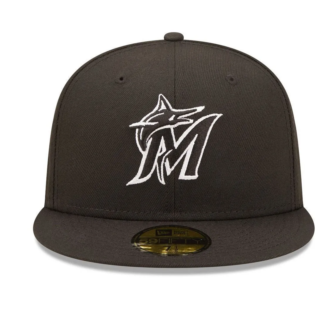 - Add a classic touch to your Miami Marlins collection with this Black and White 59FIFTY fitted hat from New Era. Along with a high crown, it offers a structured construction to add some street-ready style to your fandom. Plus, it features spirited Miami Marlins graphics in the same shade as the cap itself to further elevate any look you put together.