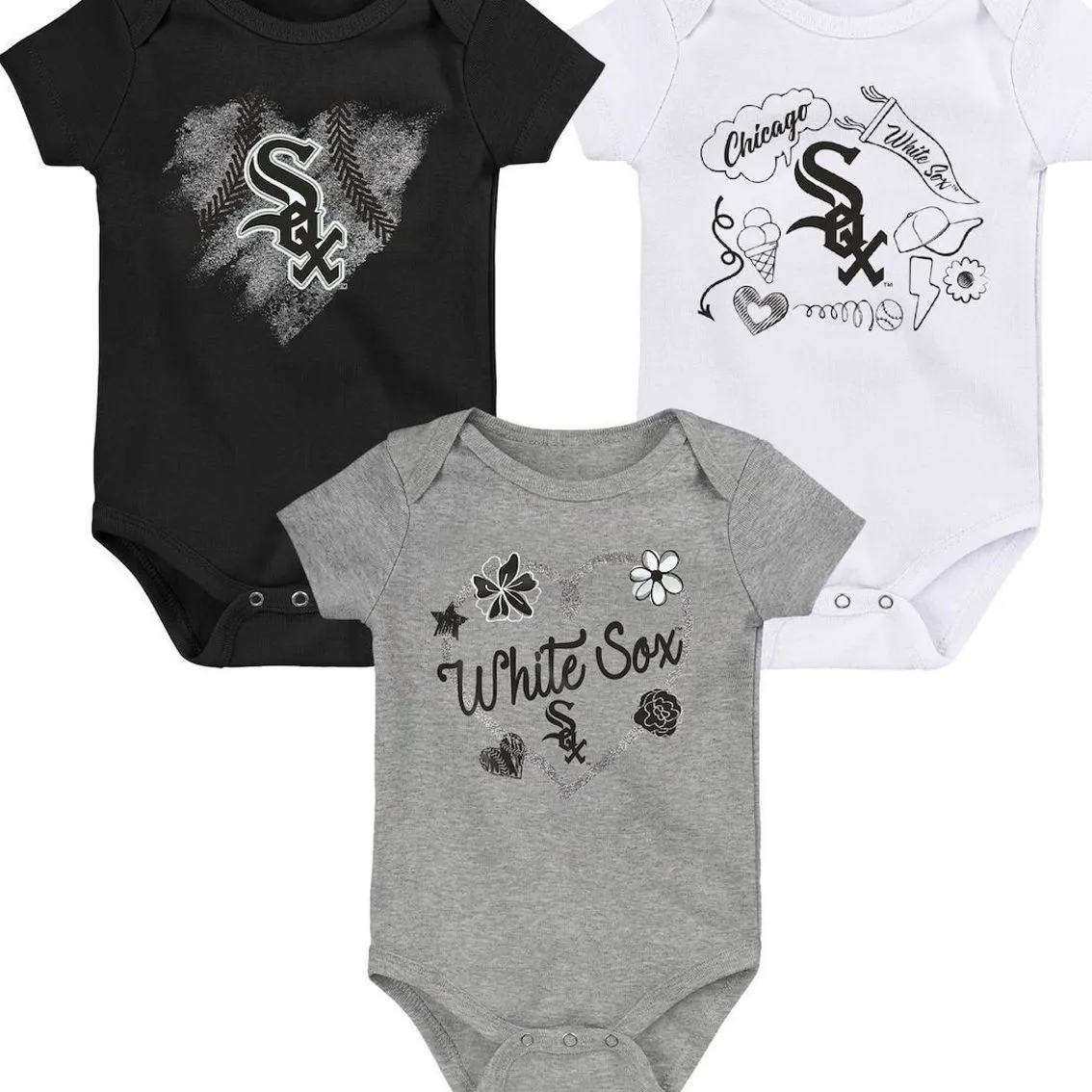 - Show everyone which ball club your little fan cheers for with these Chicago White Sox Batter Up bodysuits. This three-pack set features the official Chicago White Sox logo in a cute design printed across the front. The lap shoulder neckline and snaps also help make dressing quicker and easier.