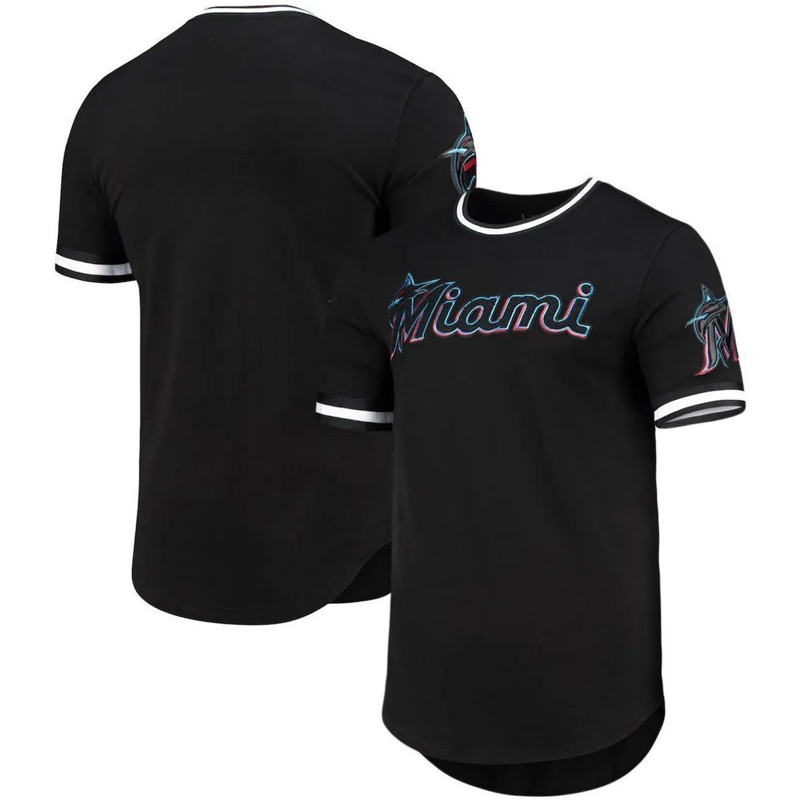 - Represent your Miami Marlins fandom in a Pro Standard T-shirt that’s sure to grab everyone’s attention. This throwback-inspired top combines the feel of a comfy tee with the design of a jersey, including a bold chenille wordmark across the chest and detailed Miami Marlins patches on both sleeves. Along with a classic droptail hem, it’s finished with clean woven stripes accenting the collar and cuffs.