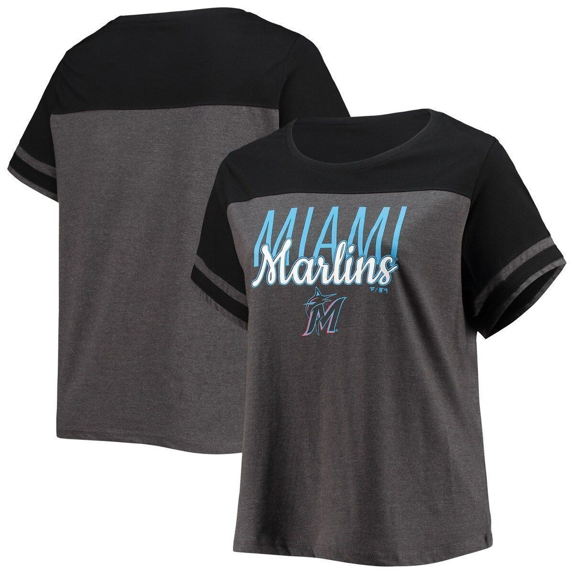 SKU: DSCO1141388875 Category: Miami Marlins Tags: Clothing & Accessories, Profile Women's Heathered Charcoal/Black Miami Marlins Plus Size Colorblock T-Shirt, T-Shirts
