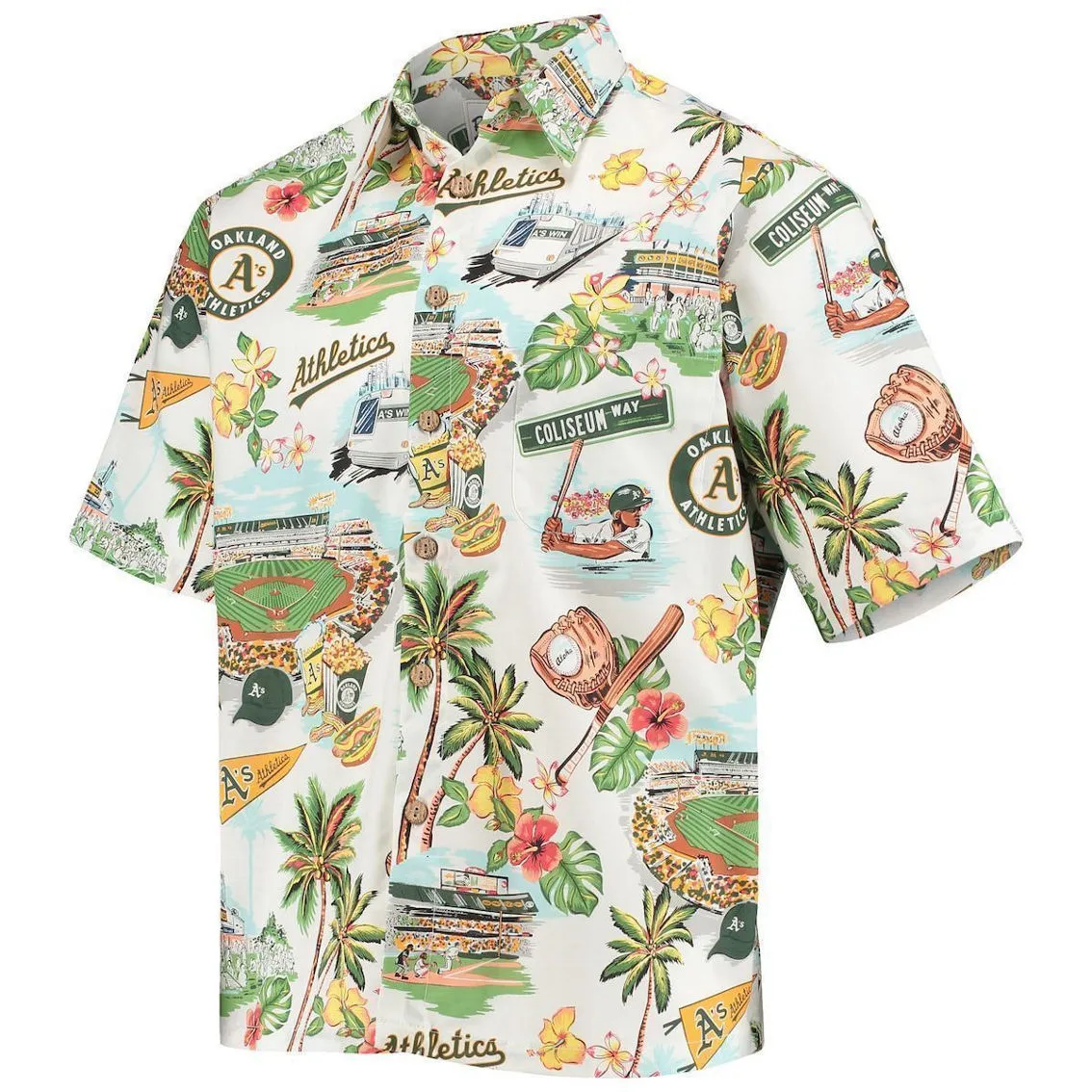 - Add flair to your closet with this Oakland Athletics Scenic button-up shirt from Reyn Spooner. The full-button front and chest pocket give off a classic look, but this top is anything but ordinary. Unique graphics commemorate the many great moments in Oakland Athletics history, so old and new fans alike can fully embrace their fandom.